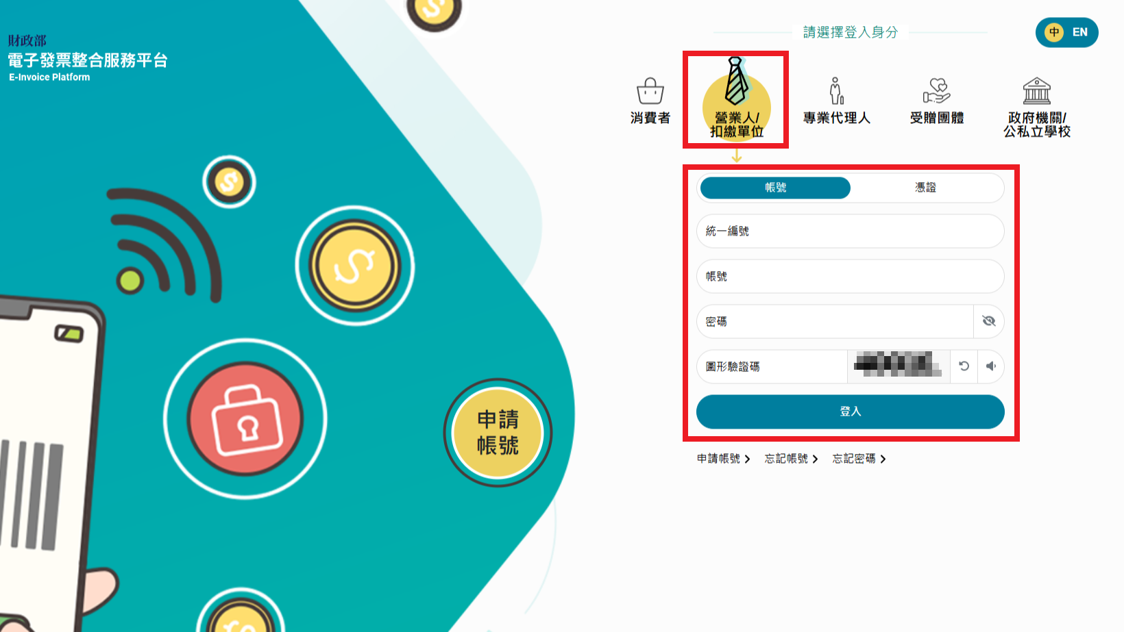 3.點選”營業人/扣繳單位”,使用帳號密碼登入(也可以使用讀卡機搭配綁定好的憑證)