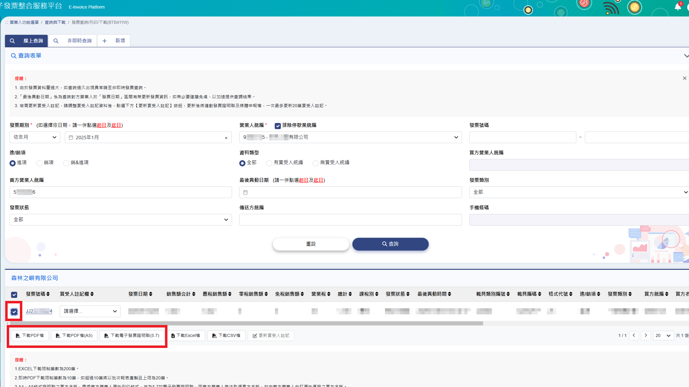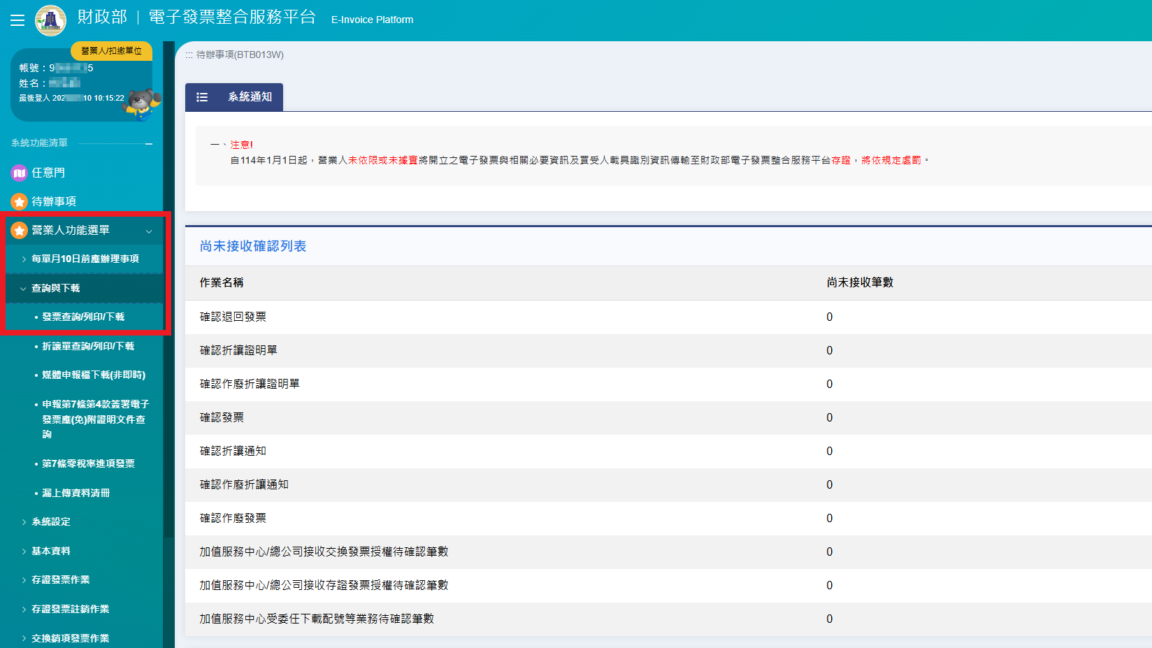 4.點選左邊”營業人功能選單”→”查詢與下載”→”發票查詢/列印/下載”