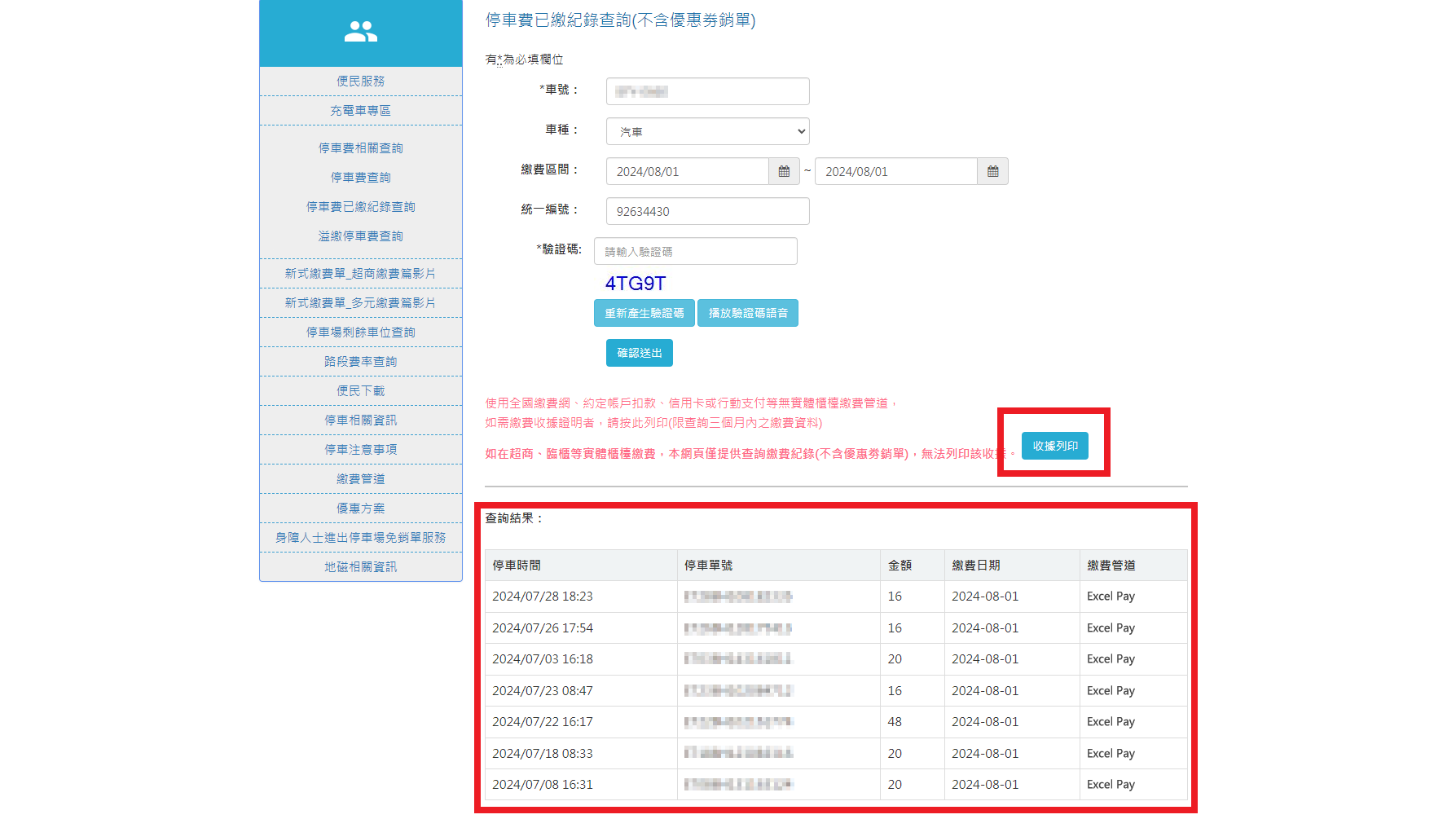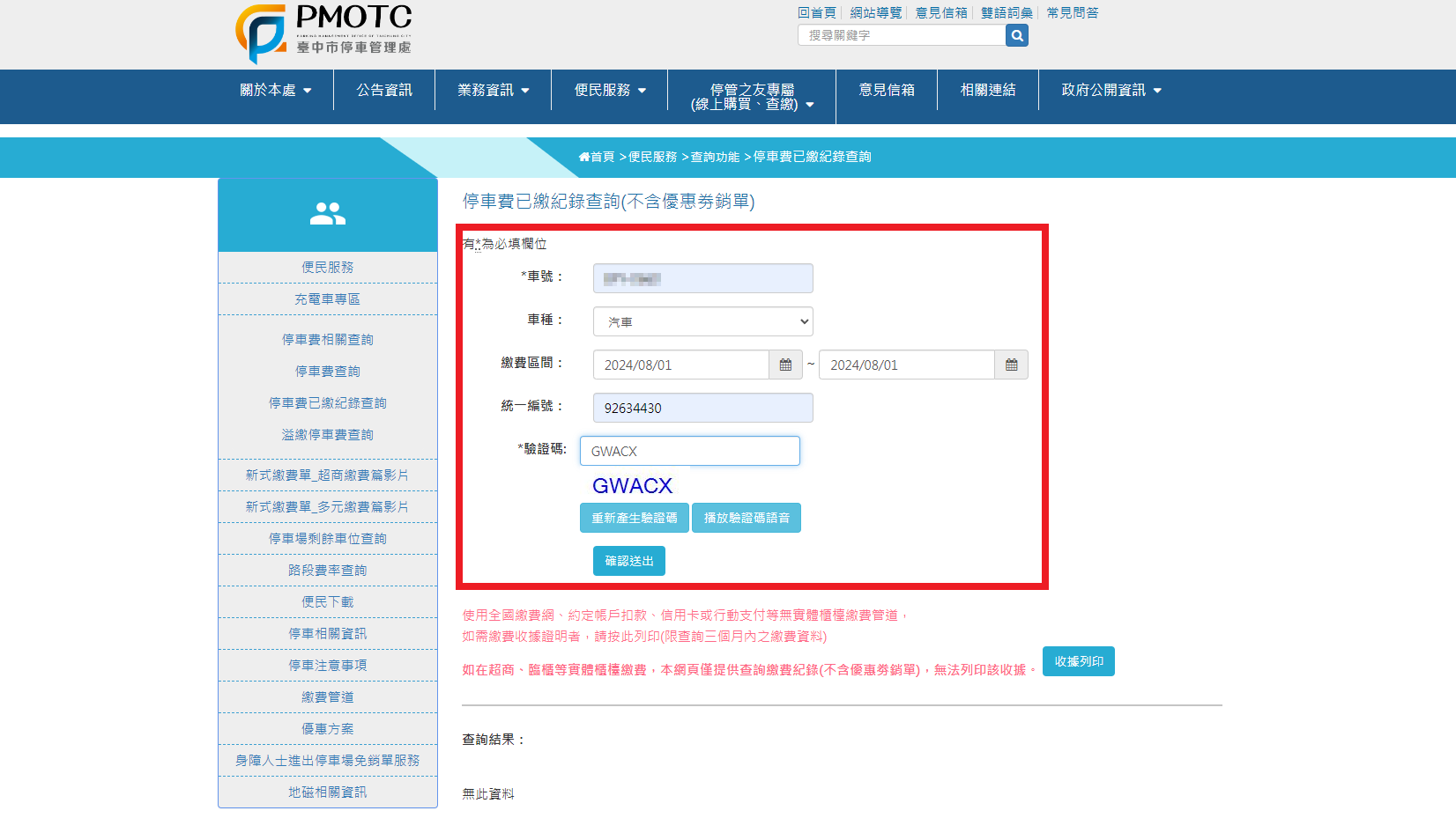 2.點選”便民服務”→”停車費相關查詢”→”停車費已繳紀錄查詢”
