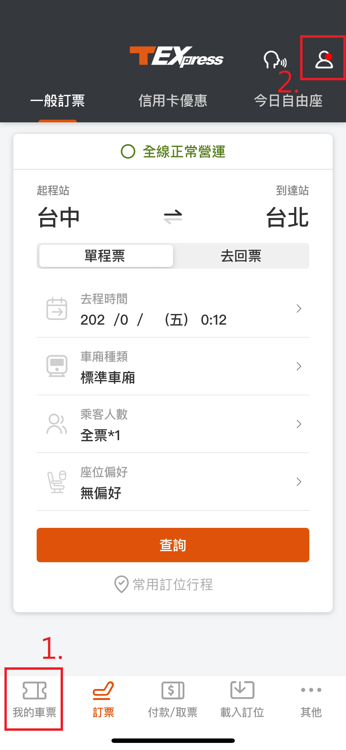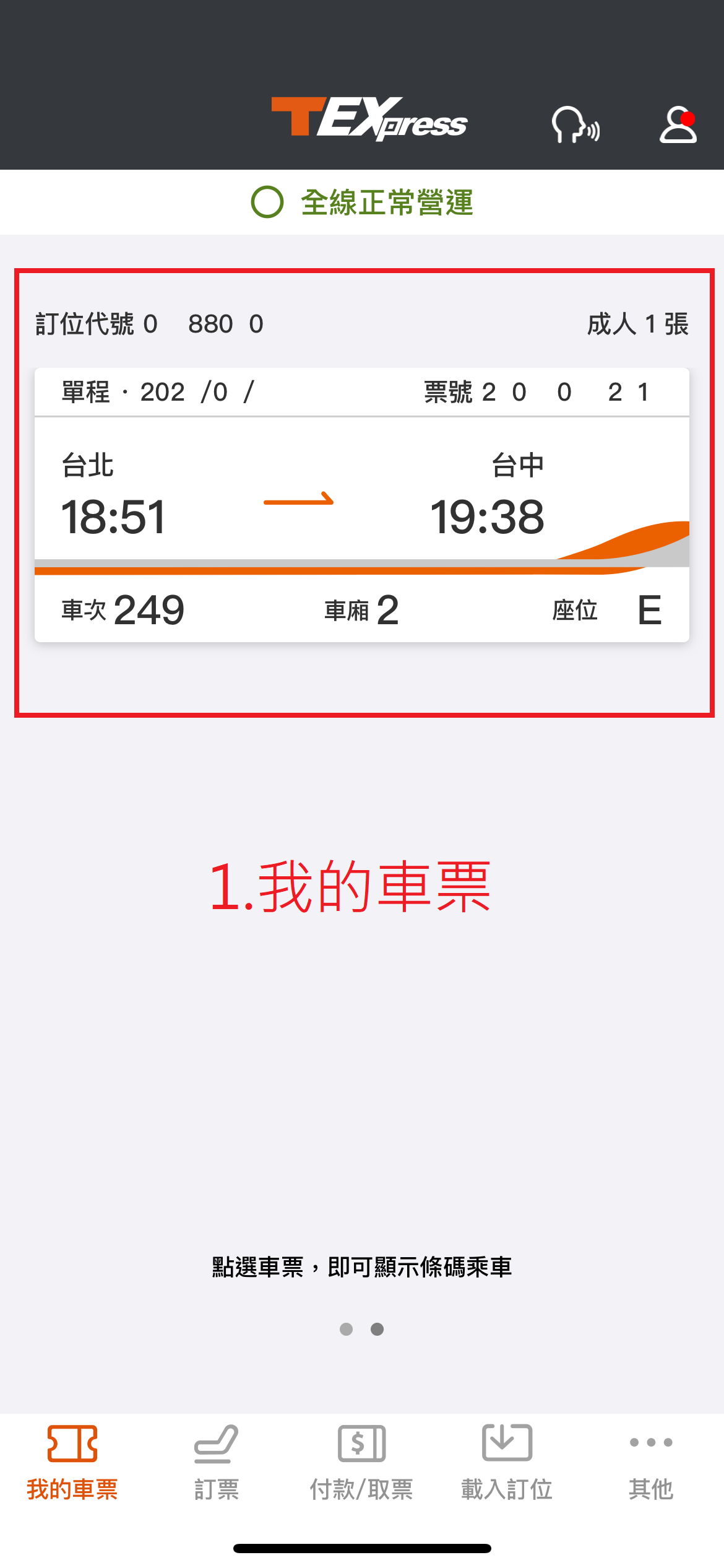 1.打開APP(T-EX行動購票)找到要扣抵的高鐵票,在”1.我的車票”或是”2.個人中心”