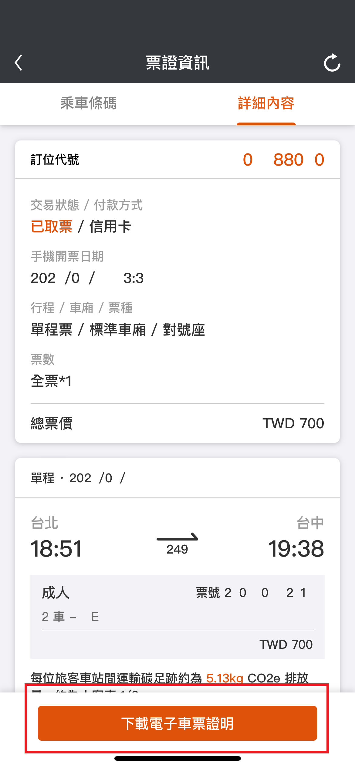 4.打開車票後,點選”詳細內容”→”下載電子車票證明”